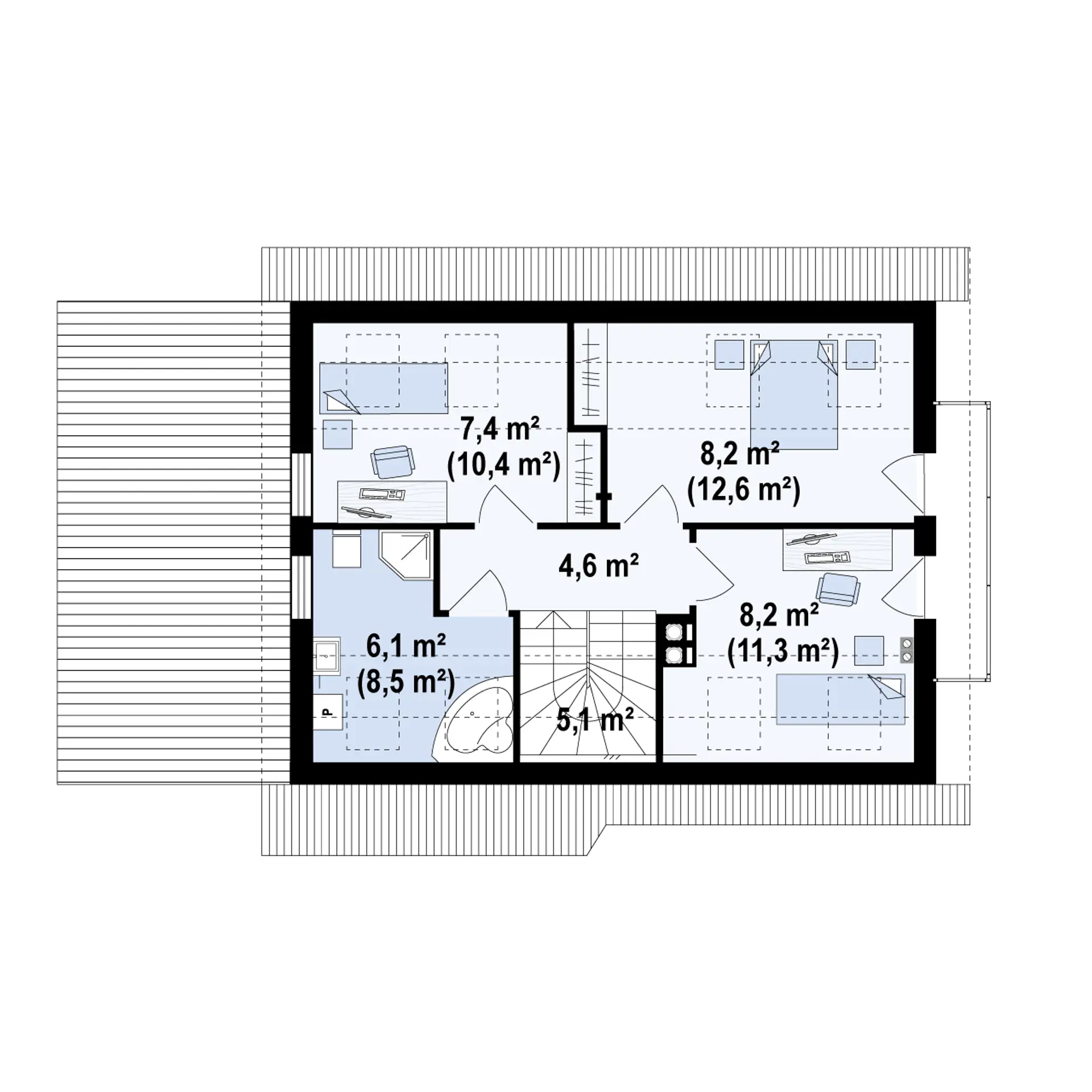 Na piętrze są dwa pokoje dla dzieci i sypialnia dla rodziców, a w każdym z pomieszczeń jest przewidziane miejsce na szafki. Obok schodów mieści się ogólnodostępna łazienka.